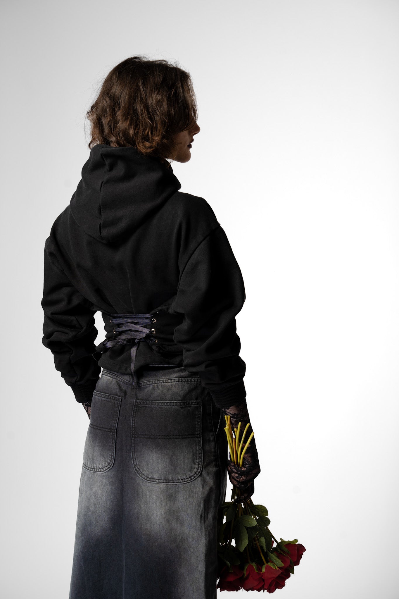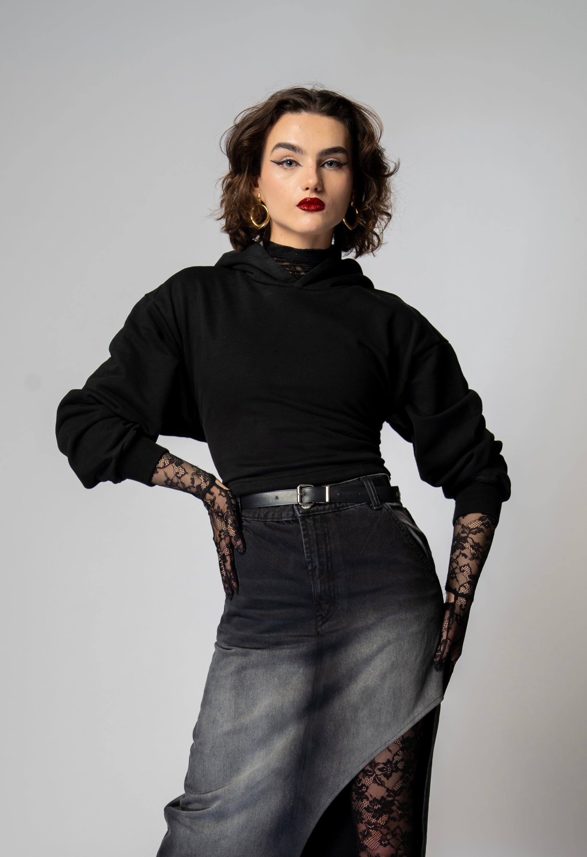 Elegancja w nowoczesnym wydaniu, czarna bluza z lekko oveersize,owym kroju z wiązaniem gorsetowym. Efektowne wiązanie pozwala dopasować bluzę do sylwetki i podkreślić talię.