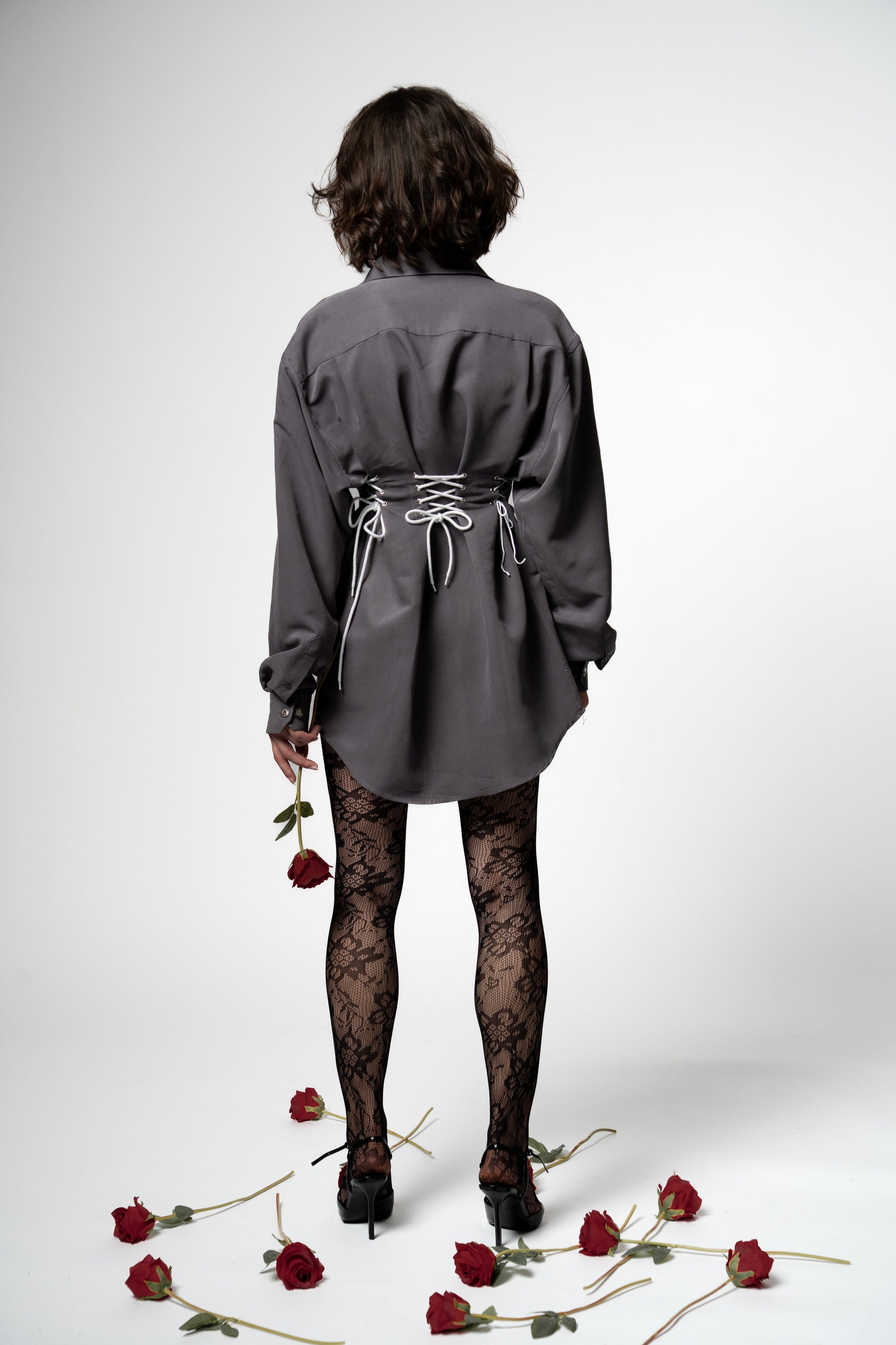 Elegancja w nowoczesnym wydaniu, szara koszula z lekko oveersize,owym kroju z wyjątkowymi guzikami. Efektowne wiązanie pozwala dopasować koszulę do sylwetki i podkreślić talię.